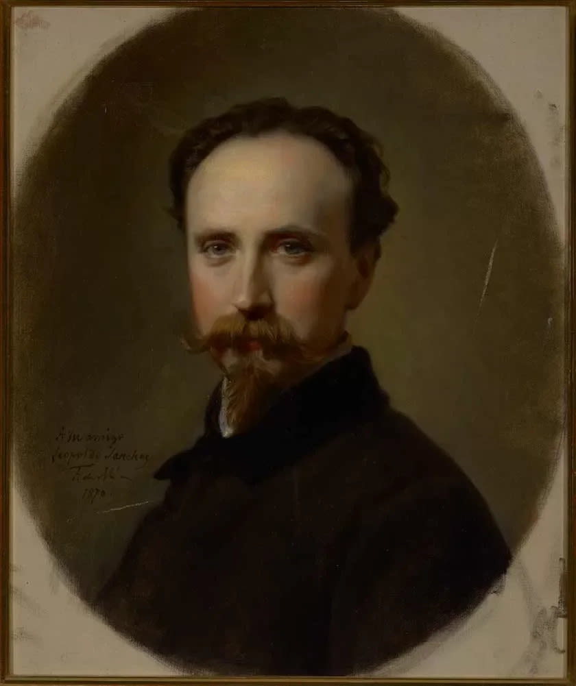 Busto de un caballero que está de perfil, pero gira la cabeza hacia su izquierda y mira fijamente al espectador. Aunque el lienzo es rectangular, el retrato está enmarcado en un óvalo. El retratado es un hombre joven vestido totalmente de negro, lleva abrochada la chaqueta hasta el cuello por el que se aprecia un poco de la camisa blanca. Destaca en su rostro el gran bigote y la arreglada barba. En este retrato, igual que en el resto de su producción, Federico de Madrazo capta la personalidad, realizando un estudio psicológico del modelo, en el que lo muestra con gran distinción y sobriedad. Aplica sobre el dibujo una pincelada corta y precisa y a pesar de ser un retrato monocromo, aporta luminosidad a las carnaciones y la mirada del caballero. Ha insertado la imagen en un óvalo de tonos neutros y oscuros, para realzar la imagen, no obstante las esquinas del lienzo están sin pintar, con alguna pincelada suelta: Tal vez con el propósito de finalizarla posteriormente. Tamaño del lienzo sin marco de 54cm x 45cm.
