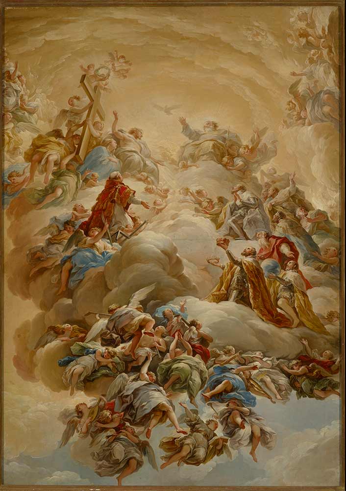 Escena religiosa cuya composición está realizada piramidalmente. En la cúspide o vértice se encuentra la paloma del Espíritu Santo, en torno a ella el Padre y el Hijo: La Santísima Trinidad. En la Gloria y sobre nubes hay profusión de ángeles casi abocetados, conformando un escenario celestial. A la derecha de la composición hay postrados un grupo de reyes que ofrecen sus coronas y posesiones terrenales, entre los que se encuentra un Santo, algunos oran, otros suplican pero casi todos dirigen su mirada hacia arriba. En el lado izquierdo hay otro grupo de Santos y ángeles portando una cruz; en este grupo y más visible se encuentra San Lorenzo que en la mediación de la composición, y casi de espaldas, dirige la mirada y el gesto suplicante a la Trinidad. Es reconocible la figura de San Lorenzo porque viste la dalmática de diácono y por el visible atributo que le caracteriza que es la parrilla, instrumento de su martirio. En la base de la composición, parte baja del cuadro, hay multitud de ángeles con diversos instrumentos musicales. En esta Adoración de la Trinidad, Vicente López realiza una composición de gran sobriedad y equilibrio. Todos los personajes están escorzados en sotto in su, como si se viesen desde abajo. Aplica pequeñas y fluidas pinceladas con una gama de colores cálidos entre los que predominan amarillos y naranjas, aportando a la escena un halo de majestuosidad, roto por los azules y verdes de algunas de las túnicas y el apenas visible celaje de la parte baja. Posiblemente esta composición fue el encargo por parte de alguna iglesia o persona con interés en que se reflejase a San Lorenzo, pues está muy visible, en un plano bastante cercano a la Trinidad y sobre todo por la muestra de su atributo de martirio. San Lorenzo fue diácono nacido en Aragón, pero martirizado en Roma por orden del emperador Decio en el año 258 de nuestra era. Tamaño del lienzo sin marco de 110cm x 79cm.