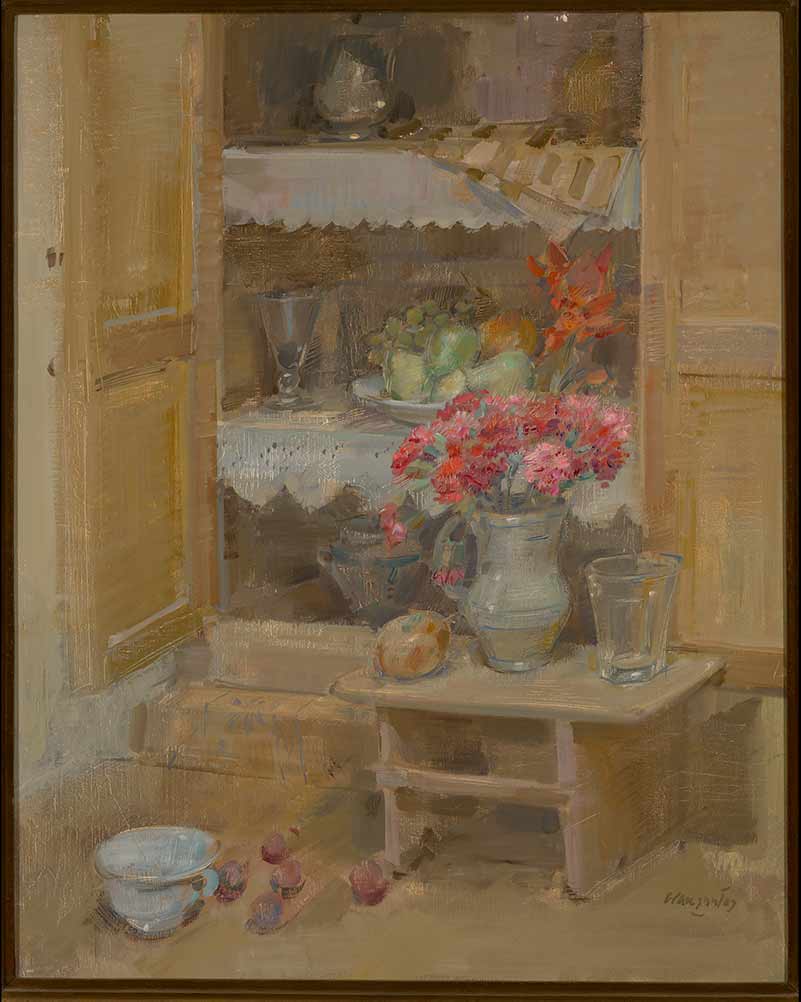 Bodegón en el que se aprecia la parte baja de una alacena. Está empotrada en la pared y bajo ella hay una mesa, tiene ambas puertas abiertas pero una, la izquierda del cuadro, tiene como tope la pared. Dentro se aprecian dos estantes y el suelo de la misma; los estantes tinen unos paños blancos con encaje, que protege y decora las baldas, y sobre ellos varios objetos como copas, jarra y plato con frutas. En la parte inferior hay cuencos y vajilla. Delante de la alacena se encuentra un pequeño banco de madera y sobre él un jarrón con claveles rojos, un vaso de cristal y una manzana. Ante éste y sobre la mesa se encuentra un tazón de cerámica y varios frutos como ciruelas. La composición está realizada de forma casi esbozada, con pincelada muy suelta y de poca pintura, apreciándose incluso el lienzo. Utiliza la parte dura del pincel o puede que espátula para definir el dibujo. Grau Santos aplica una paleta cromática en base a los ocres y blanco, añadiendo puntos de color en la fruta y los claveles. Tamaño del lienzo sin marco 80cm x 64cm.
