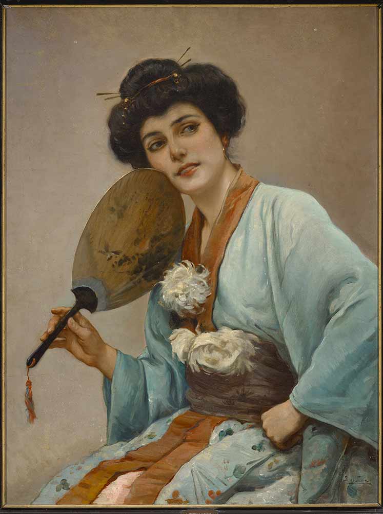 Retrato de una mujer sentada. Está de perfil con el rostro al frente a la vez que tiene la cabeza un poco inclinada hacia la derecha; lleva la mirada hacia su izquierda. Tiene una mano apoyada en la cadera, en la otra sujeta un paipai con decoración oriental que acerca a su mejilla. Llama la atención el traje, el kimono de tonos verde agua combinado con rojos: de amplias mangas y ceñido por un ancho cinturón del que sobresalen unas grandes flores. Del escote emerge otra flor, también blanca. La modelo lleva el pelo recogido en un alto moño con adornos de estilo oriental, apreciándose un pendiente de oro en la oreja izquierda. Pedro Sáenz llena de color esta composición, dándole a la expresión de la mujer un aire de dulzura y sobriedad, a la vez que da a su expresión una nota de sensualidad. Aplica un rico y equilibrado colorido. La temática orientalista fue bastante reiterativa en pintores del XIX. La atracción por el exotismo de países y costumbres lejanas, tanto en arquitectura, como en los personajes, denotaba un punto de modernidad a aquellos que lo plasmaron en sus lienzos.