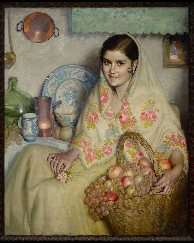 Retrato de mujer joven. Está sentada en una cocina, casi de perfil pero mira al frente, viste con el modelo tradicional de la zona de la Alpujarra. Lleva falda larga en tonos amarillo claro, cubre la parte alta del cuerpo y la cabeza con una especie de mantoncillo que recoge en el pecho; está decorado con ramos y cenefas de rosas color rosa. El manto lo tiene sujeto en la parte de atrás de la cabeza, por lo que se aprecia el pelo moreno recogido, con una pronunciada raya y un pequeño caracolillo junto a la oreja izquierda, que adorna con un pendiente azul. Tiene la cara sonriente y luminosa, mirando fijamente al espectador. La mano derecha, que asoma bajo el mantoncillo, la tiene apoyada sobre las piernas mientras que sujeta una pequeña rosa. El brazo izquierdo lo tiene extendido bajo la misma prenda, agarrando un gran cesto, que se encuentra en el primer plano de la composicion. El canasto de mimbre está repleto de fruta: manzanas rojas y verdes y racimos de uva dorada. Tras ella está la pared en la que se aprecia la parte baja de una cortina y algunos elementos de bronce colgados en la misma. Tiene un tamaño de lienzo sin marco de 100cm x 82cm.