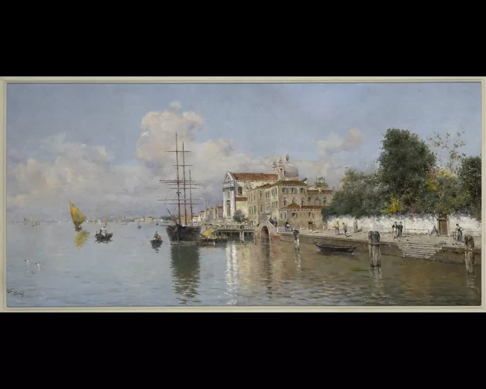 Composición en diagonal en la que se aprecia un primer plano del agua. A la mitad y centrando la escena hay una gran construcción, junto a otras más pequeñas y una gran arboleda que va hacia la derecha, en cuyo margen hay un pequeño puente y una especie de paseo, por donde van varias personas. Una escalinata baja hacia el mar en el que hay una pequeña barca parada, además de varios postes en primer plano. Delante del gran edificio y en el centro hay varios barcos, destacando uno mayor, un velero. Al fondo se aprecia la costa, velada por la atmósfera. El cielo cargado de nubes desde su parte central hacia arriba, en la que luce azul y limpio. Como ejes verticales que rompen con la horizontalidad de la composición, están los mástiles con velas plegadas del velero y dos grandes columnas que flanquean la entrada del edificio religioso. Escena de gran colorido y brillo, pintado con pequeña y empastada pincelada. Destaca el tratamiento del cielo y especialmente el del agua, en la que el reflejo y brillo dan en conjunto un lienzo característico de la técnica preciosista y que su autor elabora con gran eficacia. Antonio Reyna realizó una producción pictórica muy importante, pero también utilizó otras técnicas como el lápiz, con el dibujo y particularmente la acuarela. Tamaño del lienzo sin marco de 33cm x 69cm.