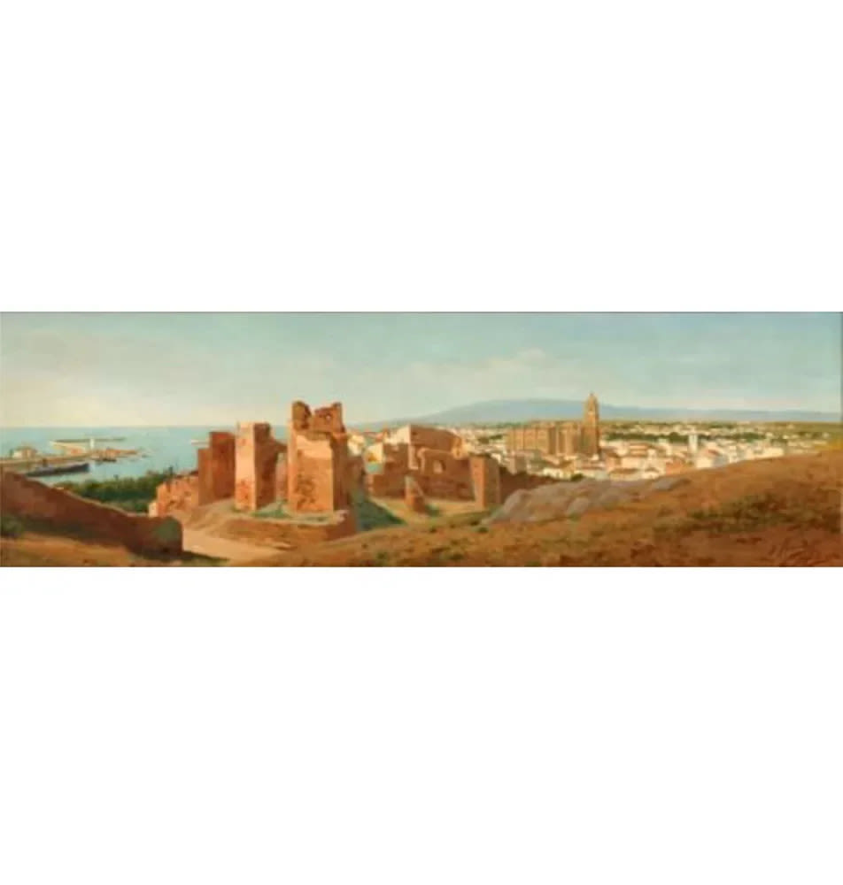 Vista de la alcazaba de Málaga desde Gibralfaro es una obra realizada por Enrique Florido Bernils en el Siglo XIX – Siglo XX, esta pintado al Óleo y tiene un tamaño sin marco de 110cm x 38cm. Si estas interesado en invertir en arte ponte en contacto con nosotros y te asesoramos. Vista de la ciudad de Málaga. El lienzo, en la parte central,
