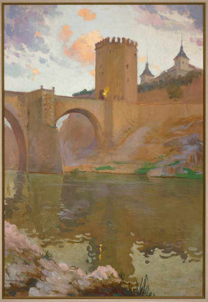 Paisaje de la ciudad de Toledo que está vista desde la orilla del río Tajo, apreciándose también el monumental puente de Alcántara y al fondo parte de los torreones del Alcázar. El el primer plano, en la parte baja izquierda del lienzo está la orilla desde la cual se ve el río que discurre mansamente, cortado a la mediación por el puente del Alcántara, situado junto al Castillo de San Servando. En la Edad Media este puente fue la puerta y el control de acceso a la ciudad por donde entraban las mercancías y las personas. Es de origen romano y fue reconstruido bajo el mandato de Almanzor, reformado posteriormente, en varias ocasiones, con importantes intervenciones de época cristiana. El puente se asienta sobre dos arcos de medio punto, más grande el central, bajo los que discurre el río, apreciándose la torre mudéjar almenada, mandada a construir en época de Alfonso X, en el extremo de la derecha. Tras la torre y en la distancia se ve parte y dos torreones del Alcázar. Aunque los vestigios de estructuras anteriores indican que siempre fue un lugar fortificado, el emperador Carlos V lo mandó construir para residencia con los mejores arquitectos del Renacimiento como son Villarrubia, Villalpando y Juan de Herrera.