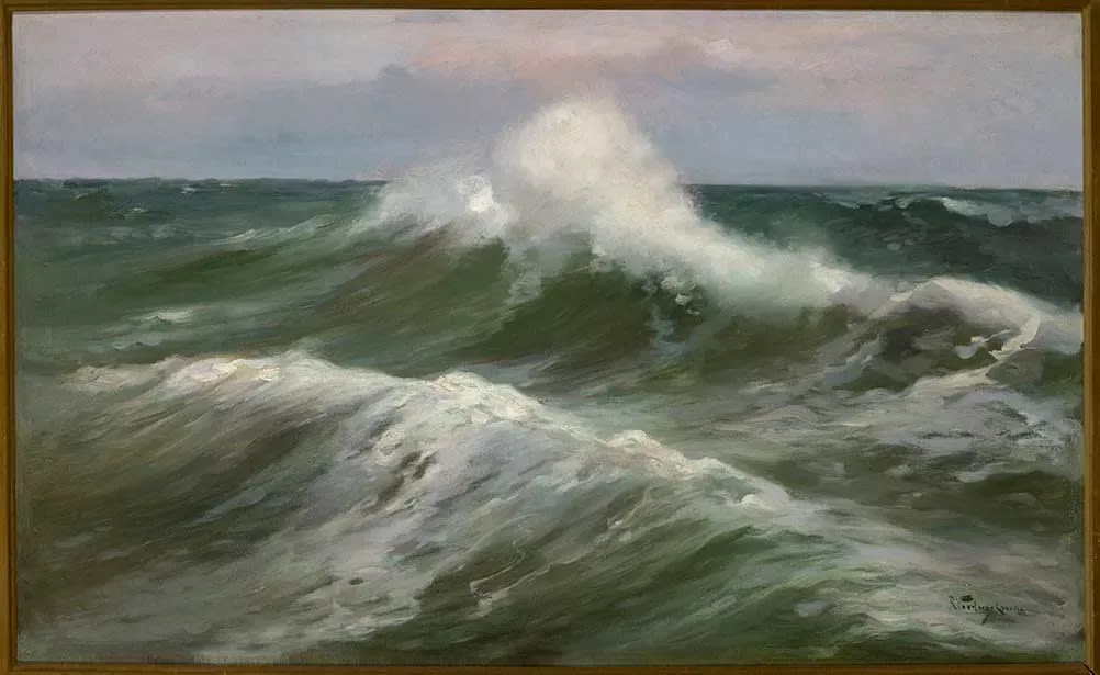 Marina con temporal en la que dos tercios de la composición están ocupados por el mar. Escena vista desde altamar con un fuerte oleaje. Como centro de la composición hay dos grandes olas, que arrancan perpendicularmente desde el ángulo inferior izquierdo. Destaca el rompimiento de la ola superior que se adentra incluso, en el especio del celaje. La parte alta del cuadro, destinada al cielo está tratada a base de colores violeta y rosa. Verdugo Landi realiza esta composición con gran fuerza en el color y las pinceladas, reforzándolas en las olas, particularmente en la espuma de las mismas. Utiliza una paleta cromática basada en los verdes, blanco y violetas, color éste último que también aplica al oleaje. Tiene un tamaño sin marco de 60cm x 98cm.