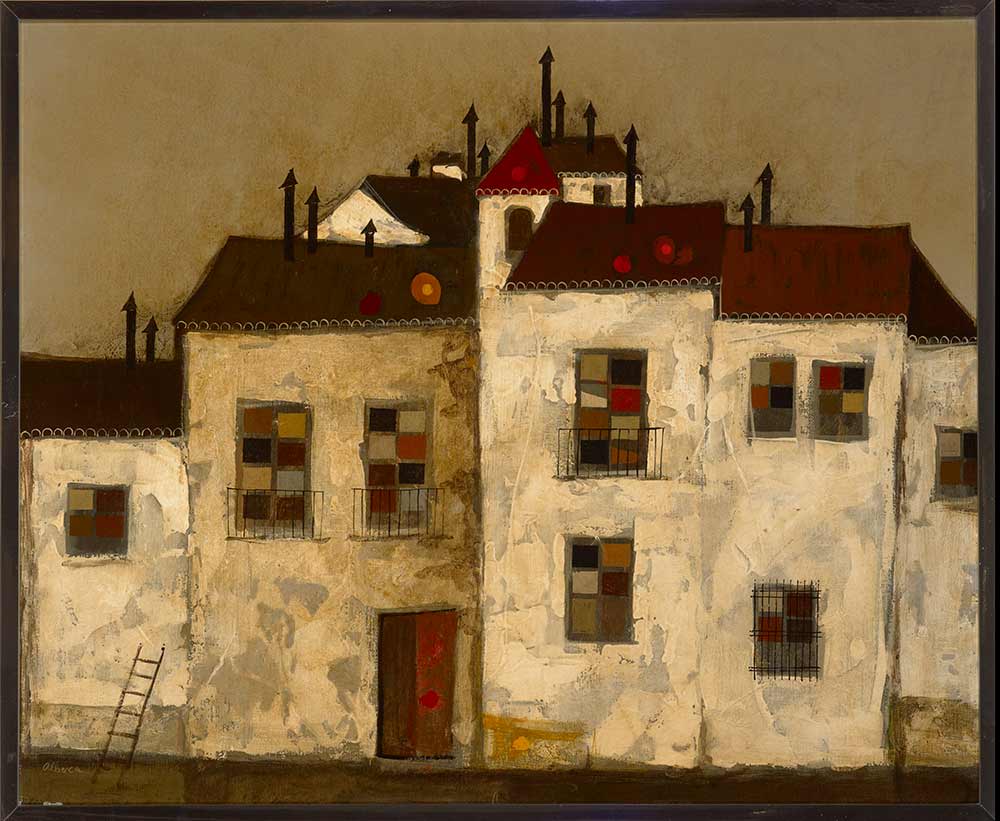 Esta obra titulada Fachada de casas, varios balcones pintada por Gabriel Alberca Castaño. Sigue la corriente de figuración. Esta pintado al óleo sobre lienzo y tiene un tamaño sin marco de 60cm x 73cm.Gabriel Alberca nace en Argel, de padres españoles, pero vive en Málaga toda su infancia. Alberca se integra con todos los honores en los orígenes de la pintura de vanguardia en Málaga, y lo es en sus dos acepciones tanto cronológica como artística, reclamando su reacción ante lo que había sido el continuismo academicista de la primera mitad del siglo xx en Málaga, heredero de las fórmulas tradicionales decimonónicas. Alberca participó junto a otros autores coetáneos en la apertura hacia nuevos planteamientos estéticos ligados a las opciones de vanguardia, que se dieron a mediados de los años cincuenta en Málaga. Se destaca su inclusión en grupos artísticos como la Peña Montmartre y el posterior Grupo Picasso.
