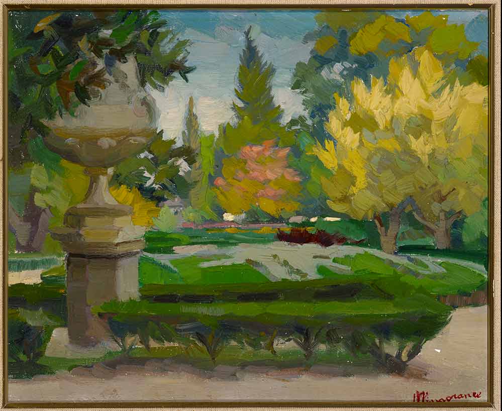 Obra titulada Jardines de Aranjuez, es una obra del siglo XX pintada por Juan Eugenio Mingorance Navas. Sigue la corriente del impresionismo lo podemos ver en este paisaje de Madrid. Esta pintado al óleo sobre lienzo y tiene un tamaño sin marco de 32cm x 39cm.