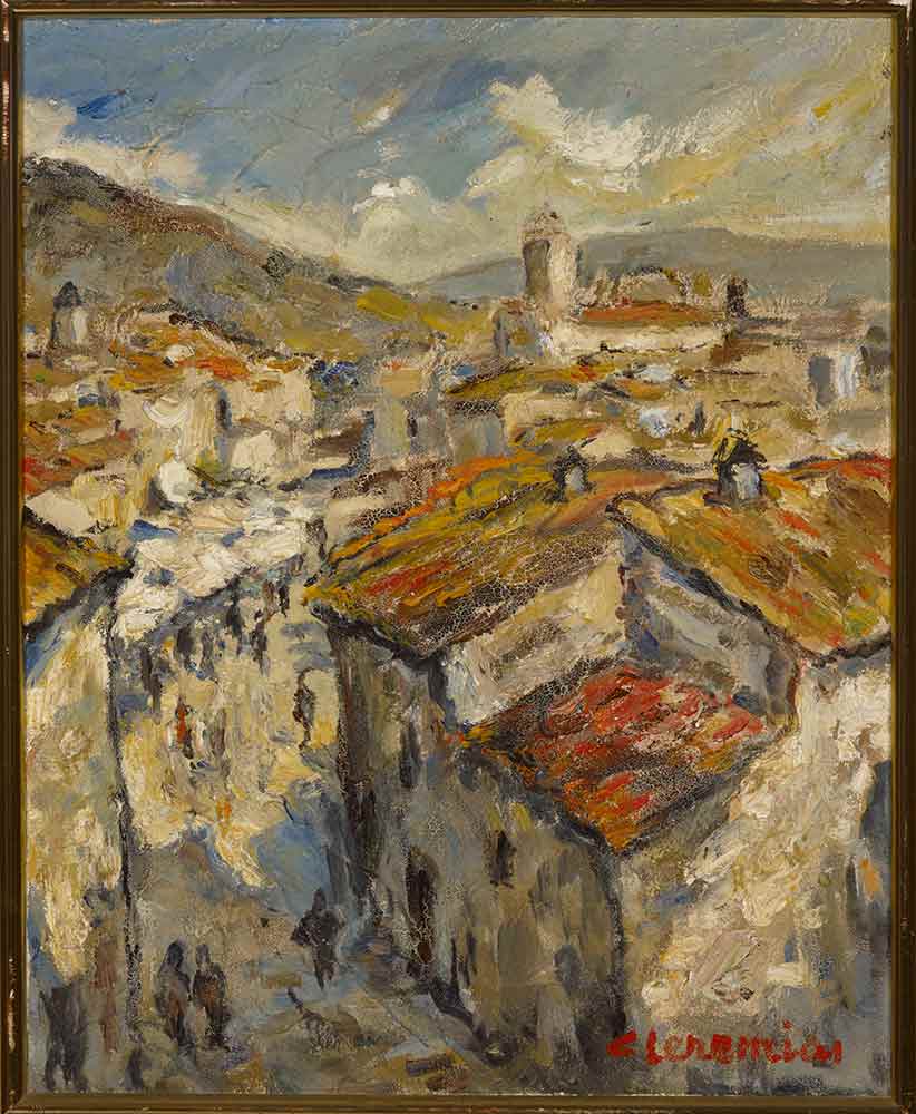 Paisaje con casas es una obra de Cleremías vemos la iconografía de un paisaje urbano. Usa técnica mixta sobre lienzo. Firmado: Cleremías, en ángulo inferior derecho. El lienzo tiene un pequeño pre-marco dorado; a su véz enmarcado por otro más grande. Tiene un tamaño sin marco de 41cm x 33cm.