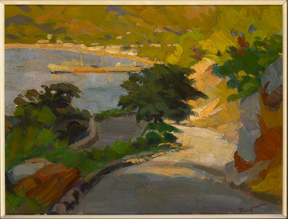 Paisaje tomado desde una perspectiva alta cuyo camino serpenteante, centrando el primer término, está rodeado de arboles y al fondo vemos el mar. Esta obra esta realizada por Juan Eugenio Mingorance Navas y esta titulada Paisaje costero. Sigue el impresionismo del siglo XX. Esta pintado al óleo sobre lienzo y tiene un tamaño sin marco de 30cm x 40cm.