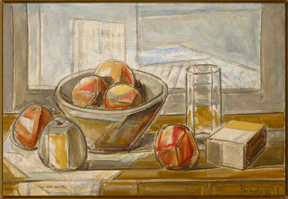 Sobre una mesa se asientan varios objetos que conforman este bodegón. Cubre la superfície de ésta un paño blanco, que sólo tapa la esquina izquierda; sobre él hay un frutero o canasta con tres piezas de fruta, manzanas. Bajo éste y delante hay otras dos piezas. Al lado derecho de la composición se aprecia un jarro de cristal, de forma exagonal, una caja y otra fruta. Detrás ocupando la mitad superior del cuadro, hay una ventana a través de la cual se observan otras formas lineales. El pintor realiza la composición a base de elementos geométricos, casi esbozados y con muy poca pintura, transparentándose a través de ella el propio lienzo. Aplica colores cálidos como los naranjas, marrones y ocres, con un punto de frío en la transparencia de los cristales y en las pinceladas sobre el paño blanco. Este estilo propio le acompañará toda su vida, alternando con experimentos abstracto-geométricos donde se denota en la importancia del modelo, lo estricto del dibujo, la racionalización de lo representado y el uso del color con calidades de acuarela. Joaquín Peinado es considerado como una pieza fundamental para la revisión del arte español contemporáneo y la llamada Escuela Española de París, así como por su acercamiento a lenguajes plásticos como el Neocubismo, la Figuración lírica o la Abstracción. Tiene un tamaño sin marco de 37cm x 54cm.