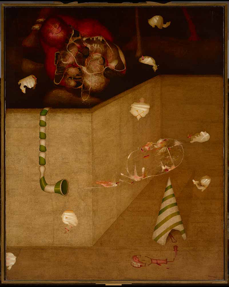 Composición en la que se aprecia una valla zigzagueante como delimitación de espacios: alto-bajo, claro-oscuro, delante-detrás y sobre todo de un antes y un después. Se caracteriza por la plasmación en ella de una figuración fantástica con infinidad de formas de apariencia surrealista emanadas de la imaginación y posiblemente de la situación política y social que vive el autor en el año en que realiza la composición, aportando algunas pistas con el propio título. En pleno inicio de la transición en nuestro país, Enrique Brinkmann está vinculado a la política, posteriormente en 1977 sería Senador durante la Legislatura Constituyente, y plasma en este lienzo una lectura de la situación de ese proceso democrático que está incipiente, y que aún tiene una gran carga residual. Proceso que viene lleno de ilusiones y nuevos planteamientos en los que la información tenía un papel crucial, en este caso con los panfletos. El artista ejecuta la obra con ligera pincelada, analizando la inserción de cada elemento con gran meticulosidad. En tonos rojizos, ocres y marrones crea una atmósfera irreal e inquietante, reflejo del momento en que se encuentra. Encaja perfectamente en la tercera etapa de su trayectoria artística, apreciándose aún las formas en la composición, que en otras etapas. El tamaño del lienzo sin marco es de 162cm x 130cm.