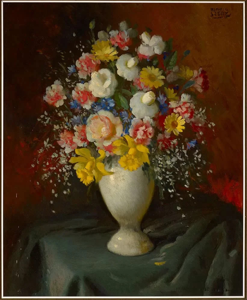 Esta obra titulada Motivo Florero es perteneciente a la corriente del Impresionismo, podemos observar un jarrón con múltiples flores coloridas. Es una obra pintada al Óleo sobre lienzo. Firmado: Rafael G. Sáenz, en ángulo superior derecho. El lienzo sin marco tiene un tamaño de 72cm x 58cm.