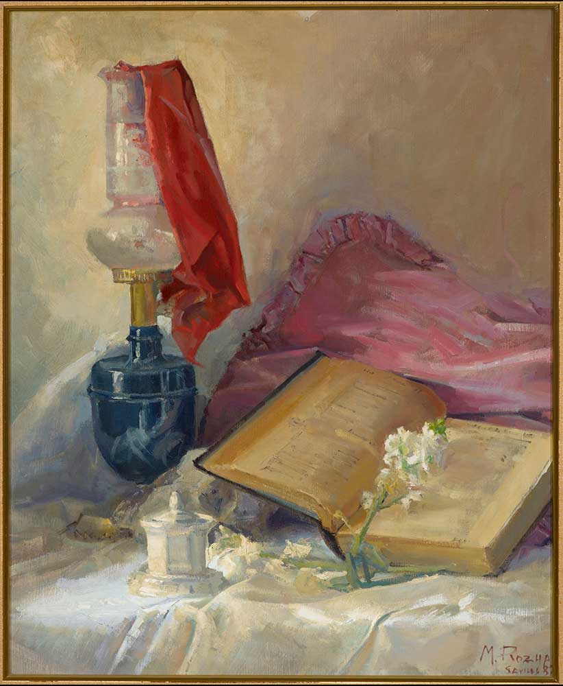 En la parte baja del lienzo y en primer plano hay un paño blanco, sobre una superficie, que se prolonga hacia el fondo. Sobre éste conforma la escena un libro abierto que reposa sobre un cojín color rosa y tiene entre sus páginas una rama de alhelí blanco. También hay un quinqué con el recipiente en cerámica oscuro y la tulipa de cristal labrada que está medio cubierta por un paño rojo. Ante estos objetos hay una pequeña cajita de cerámica blanca. Cierra la composición la pared de tonos claros. A pesar de tener un potente foco de luz proveniente de la izquierda, la escena está muy suavizada, sin grandes contrastes, conformando con los colores un ambiente muy cálido. El autor aplica una suelta y pastosa pincelada, elaborando la escena a base de manchas de color. Destaca el blanco y las texturas de las telas, rompiendo con los colores pasteles el oscuro del quinqué y el paño rojo que hay sobre él. La pared está compuesta a base de color, ya que tiene todos los colores del resto de los objetos, todos forman parte de un todo. El montaje escenográfico, con los elementos que lo componen cuidadosamente puestos, nos lleva a intuir una añoranza romántica, dulcificada por la cálida luz que los envuelve. Tiene un tamaño sin marco de 72cm x 59cm.