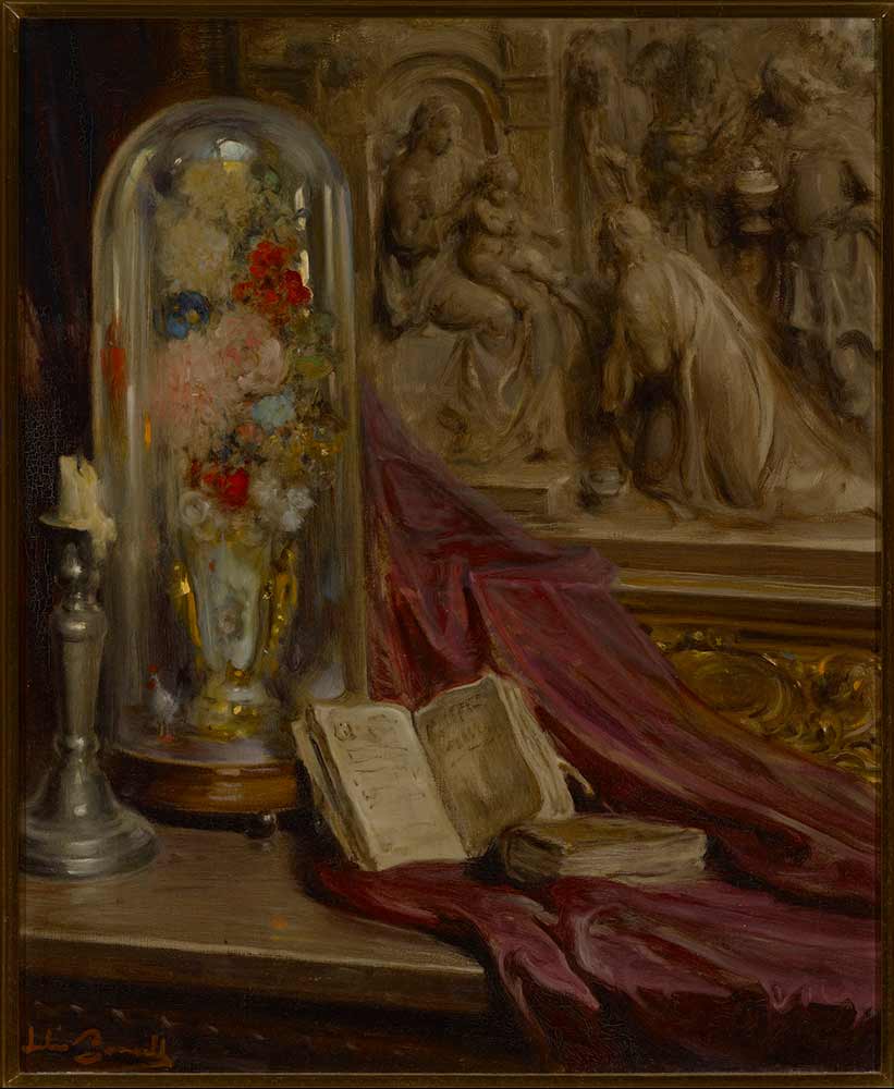 El bodegón se plasma sobre el filo de una chimenea cuyos elementos compositivos dividen el cuadro diagonalmente. Sobre ese filo o superficie, de izquierda a derecha hay un portavelas y una urna de cristal de forma cilíndrica en cuyo interior hay una jarrón de cerámica y flores de varios colores. Detrás de la urna se aprecia un paño en tono rojizo que cae hacia el filo y cuelga hasta perderse de vista; sobre la tela hay dos pequeños y ajados libros o misales; uno está abierto y se apoya en el cristal, el otro se mantiene cerrado. En el fondo de la composición y ocupando la diagonal superior, se aprecia en altorelieve una Adoración de los Reyes, apreciándose a los Magos en actitud de ofrenda ante Jesús que está sentado sobre el regazo de su madre. El autor realiza esta obra con pincelada muy suelta, a base de manchas de color. Utiliza una paleta en la que predomina el sepia y los colores cálidos, destacando las flores y las pequeñas pinceladas con las que da brillo al cristal de la urna.