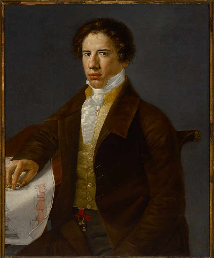 Retrato en tres cuartos de un joven caballero de pelo castaño y ojos del mismo color. Abarca toda la composición y está sentado mirando fijamente al espectador. Mantiene su brazo derecho apoyado en una mesa a la vez que tiene un compás dorado en la mano. Bajo ésta hay un plano extendido en el que se aprecia parte de algún proyecto arquitectónico. Viste a la moda romántica, con pantalón verde oscuro sobre el que lleva una levita color marrón. Destaca el chaleco amarillo y la camisa blanca con cuello de puntas altas; lleva un pañuelo también blanco anudado y le sobresale en la parte alta del chaleco un adorno plisado de la camisa. Se aprecia sobre el mismo una pequeña llave dorada, a la vez que por la parte baja del chaleco tiene sujeto otro adorno, consistente en una pequeña lazada roja con un aro y una especie de campanillas. El semblante del retratado es serio, denotando sobriedad. El fondo está tratado con un azul grisáceo oscuro, sin decoración, roto solamente en la parte central derecha, por una esquina del respaldo de la silla en la que se encuentra el caballero.