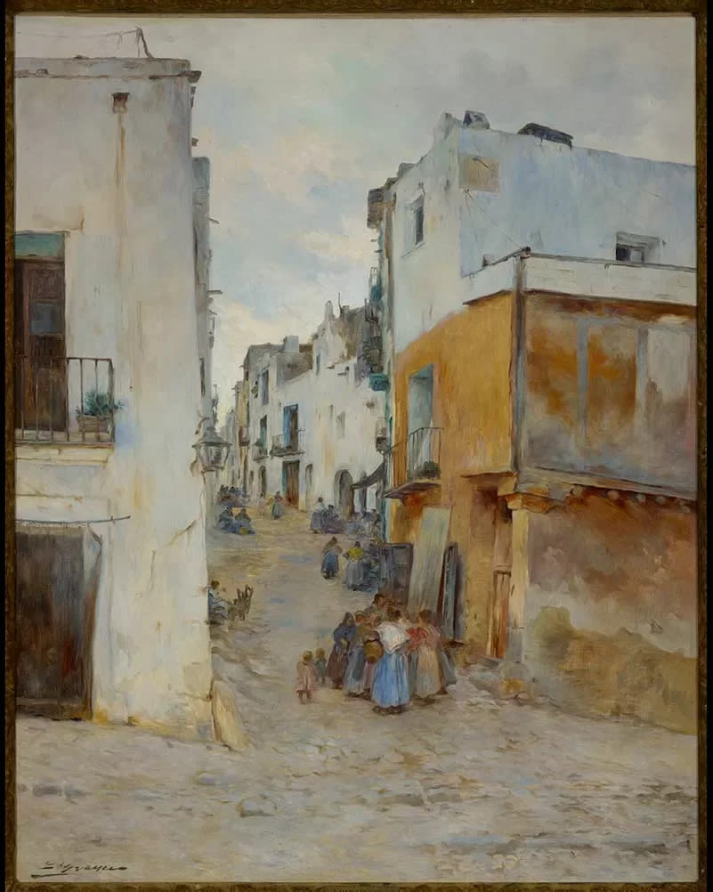 Luis Graner Arrufi autor de esta obra llamada Pueblo español, una obra pintada al Óleo sobre lienzo y que sigue el modernismo catalán. Vemos representado un pueblo. Esta firmado: L. Graner, en ángulo inferior izquierdo. Tiene un tamaño sin marco de 100cm x 79cm.