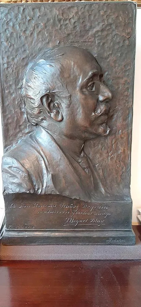 Busto del pintor Muñoz Degrain en relieve. Blay nos lo presenta de perfil valorando la riqueza expresiva de su silueta, que se destacasobre el fondo levemente golpeado. Un sencillo y magnifico retrato, limpio de todo elemento secundario e innecesario para su captación anímica. Altura = 64 cm; Anchura = 38 cm; Profundidad = 9 cm