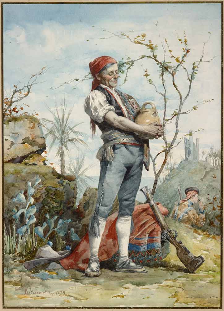 Esta obra titulada Bandoleros de la serranía esta pintada por Bernardo Ferrándiz y Badenes. Es una obra del siglo XIX, sigue el realismo-costumbrismo y pertenece a la Escuela Malagueña. Esta pintado en Acuarela sobre Papel. Esta firmado: B.Ferrándiz/1879, en ángulo inferior izquierdo. Tiene un tamaño sin marco de 39cm x 28cm.