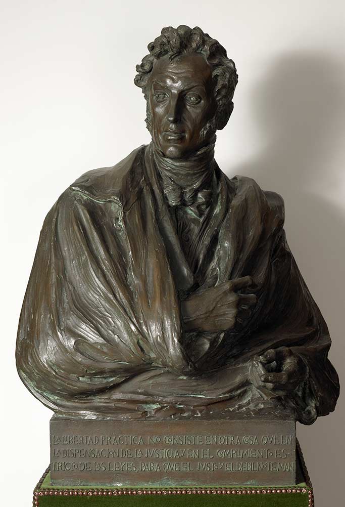 Gran escultura realizada en bronce en la que se retrata al libertador Simón Bolívar. El busto muestra a un hombre joven de rasgos finos y elegantes que peina y viste al estilo romántico. En el cuello se aprecian los picos de la camisa que está rodeada con un amplio lazo, viéndose la lazada en la parte cental; también se aprecian los botones de la misma y el filo de un chaleco, sobre él la solapa de una levita. Destaca de su vestimenta la capa con amplio cuello que le cubre todo, cruzándosela en el pecho y echándola sobre su hombro izquierdo. A la altura del pecho se ve la mano derecha que sujeta el filo de la capa mientras la echa hacia atrás. La mano izquierda sobresale más abajo, en ambas se aprecia un pequeño detalle de las mangas de la levita. La escultura a tamaño natural está trabajada con gran minuciosidad, destacando el rostro, el pelo y sobre todo las manos. El tratamiento de la capa no es tan detallado aunque sí tratado con sensación de soltura y movimiento, más apreciable en la parte trasera en que los pliegues hacen grandes contrastes. El tratamiento de la capa no es tan detallado aunque sí tratado con sensación de soltura y movimiento, más apreciable en la parte trasera en que los pliegues hacen grandes contrastes.