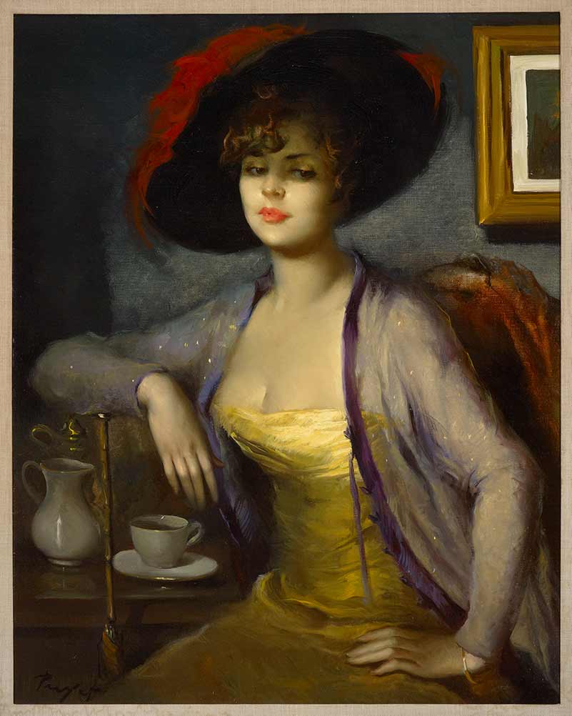 Retrato de una mujer joven en el interior de una estancia. Sentada mira al frente mientras que apoya la mano izquierda sobre la pierna, la derecha le descansa sobre el mango de una fina sombrilla cerrada. Lleva un vestido largo de tonos amarillo en el que destaca un gran escote; sobre éste tiene puesta una especie de rebeca fina y larga en tonos dorados y morado. Tiene el pelo claro recogido y poco visible pues lleva un gran sombrero oscuro en la parte interior, en el que llama la atención las plumas rojas que sobresalen por los filos del mismo. Su semblante es tranquilo, mirando fijamente al espectador. Por la frente le caen unos rizos del pelo; manteniendo la parte superior de la cara en penumbra por el sombrero, mientras que la parte baja muestra una boca pintada en rojo muy sensual. Tras ella se aprecia el respaldo de la silla donde está sentada y parte de una mesa, a su derecha hay un servicio de café en loza clara. La pared del fondo es neutra, con la decoración de un cuadro, del que sólo se ve el marco en la esquina superior derecha.
