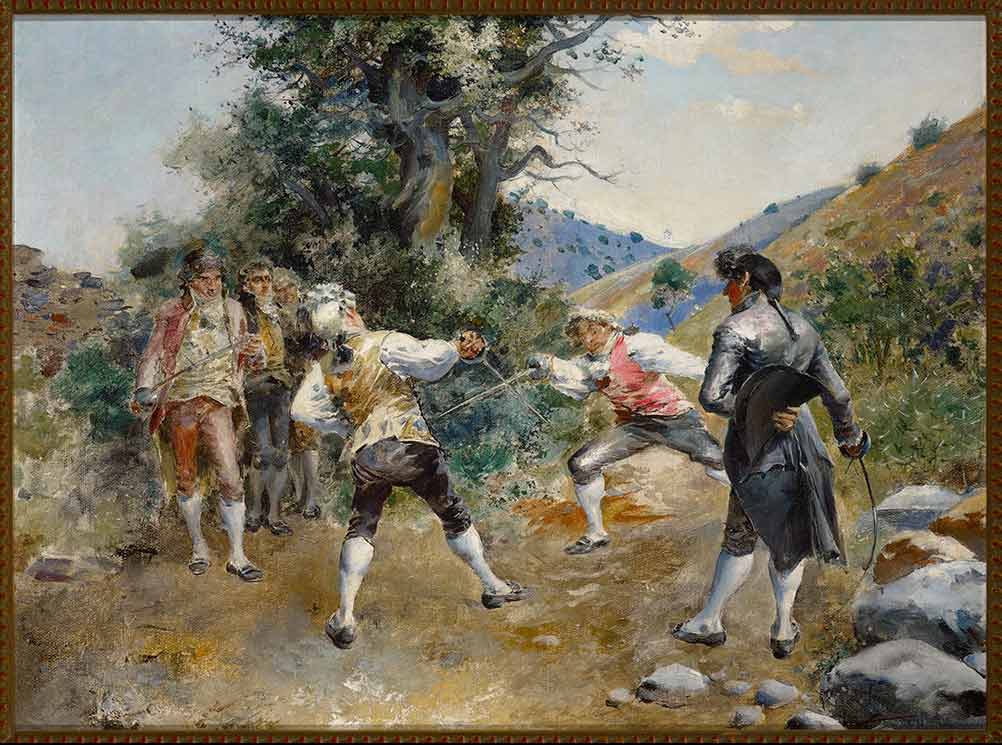 Escena que se desarrolla al aire libre. Un gran árbol divide casi por la mitad el lienzo, rodeado de arbustos está asentado en un suelo pedregoso con suaves colinas alrededor. Centran la composición un grupo de personajes, todos hombres, duelistas que, vestidos a la moda dieciochesca, se baten en duelo. Dos espadachines están en plena contienda, mientras a la derecha y de espaldas hay un caballero que, se supone, controla y arbitra la situación. Al extremo izquierdo hay un pequeño grupo formado por tres hombres que son testigos también de lo que ocurre. Al fondo y a ambos lados del árbol se aprecia el cielo. El pintor trata la escena con pincelada muy detallada en los tres personajes más cercanos y en el árbol, vibrante, con una paleta rica en color con gamas de marrones, verdes y azules. Dibuja las figuras perfiladas, con trazos firmes para destacarlas del fondo, dándoles una gran riqueza de movimientos y plasmando así, una escena de gran realismo. El resto de la naturaleza está tratada a base de pequeñas y rápidas pinceladas. Tiene un tamaño sin marco de 43cm x 48cm.