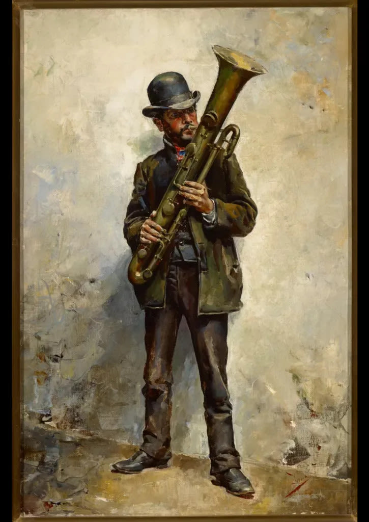 Sin referencia espacial y geográfica, con fondo liso y una división diagonal en la parte baja de la composición para separar el suelo de la pared. Centra la escena un hombre de mediana edad, con ropa raída y oscura, tonos de marrones y verde, y con un calado bombín. De pie, casi apoyado a la pared sujeta entre sus manos un trombón, instrumento que está tocando ya que tiene la boquilla en la boca. El músico tiene un aire tristeza, pero transmite dignidad en su trabajo. El pintor resuelve la figura del músico con pinceladas pastosas y cortas, dando la impresión de crear duras aristas en su ajado traje. Por su parte el trombón y las carnaciones las elabora utilizando el pincel cuadrado de cerdas cortas, conformando con ellas las diferentes matizaciones para graduar la luz, que va de derecha a izquierda y crean el relieve de la figura. Para el magnífico fondo utiliza la espátula aplicando gamas de sepia, verde y blancos. Esta técnica llama la atención por su frescura e innovación, dentro de la trayectoria de Denis Belgrano, y que aplicará en posteriores trabajos de su tercera etapa. A modo de curiosidad hay que decir que las espátulas que utilizaba para sus composiciones, las creaba él mismo con finas cañas.