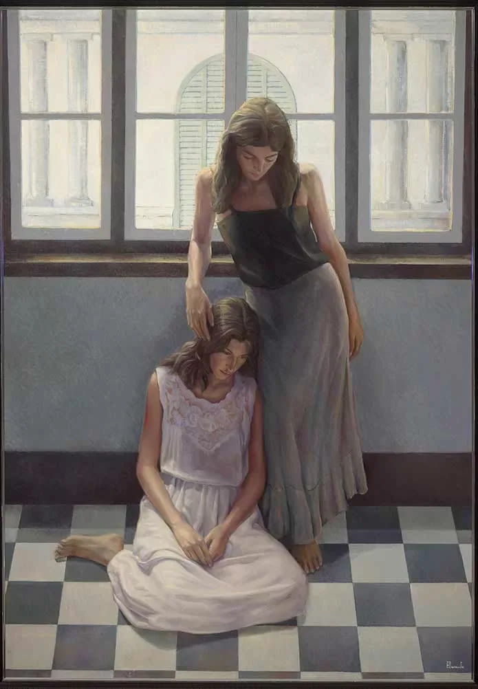 Escena de interior en el que hay dos jóvenes mujeres. El espacio está delimitado en tres franjas horizontales: suelo, pared y ventanal. Se encuentran en una sala centrando la composición. Una de ellas está de pie, la otra sentada en el suelo. La mujer que se encuentra de pie apoya el codo derecho en el marco de la gran ventana, manteniendo una pose de descanso mientras mantiene la cabeza hacia abajo. La mano roza la cabeza de la otra joven que está sentada en el suelo, con las piernas dobladas y las manos juntas sobre el regazo a la vez que apoya la cabeza en la pierna de su compañera. Ambas tienen el pelo largo y suelto y están descalzas. Ambas visten ropa ligera de faldas largas; la que está sentada en color rosa, en tonos marrón y crema la que está de pie. Las dos se encuentran ensimismadas, cabizbajas, en estado nostálgico, iluminadas por la fuerte luz que entra por el ventanal y baña toda la sala. Resalta el suelo de la habitación que a modo damero combina baldosas blancas y grises. Tras el amplio ventanal se aprecia otra fachada con una gran ventana central, cubierta por persianas verdes y columnas a ambos lados.