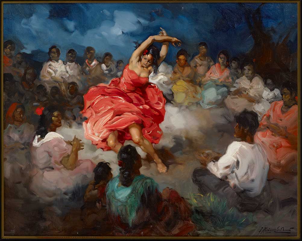 Al aire libre hay un gran grupo de personas que están sentados en el suelo formando una rueda y que abarcan toda la composición. En medio de ellos se encuentra una figura femenina bailando. Está en plena ejecución de su danza; lleva los brazos hacia arriba, cruzándolos sobre la cabeza. Destaca el pelo oscuro y largo con un flor roja prendida en el mismo. Sus gestos denotan movimiento, reforzados por la gran soltura y vuelo del vestido rojo que lleva. Los componentes del grupo que la rodean son hombres, mujeres y niños que cantan y la jalean tocando palmas: Los del primer plano están de espaldas, los de los laterales y fondo de la rueda están de frente aunque apenas perceptibles. Por la oscuridad reinante fuera del grupo, la fiesta parece realizarse en plena noche. El autor plasma esta escena con una fluida y pastosa pincelada en la que aplica una rica paleta cromática, destacando el rojo. Hay partes del cuadro en que apenas pasa el pincel y mediante manchas de color trabaja abocetadamente a los personajes. La parte superior del lienzo muestra un nocturno, nuboso y colorido celaje. Tiene un tamaño sin marco de 63cm x 79cm.