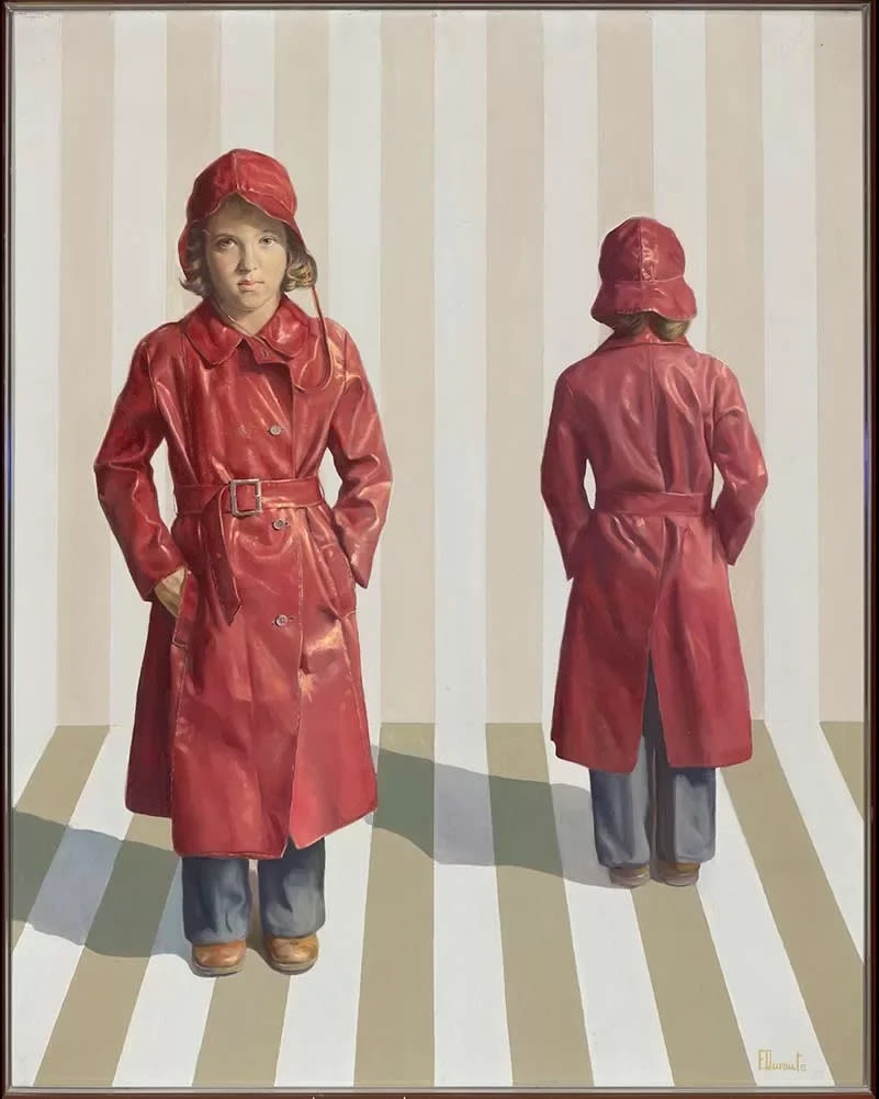 Retrato hiperrealista en el que casi simétricamente, se pueden apreciar dos figuras de cuerpo entero. A la izquierda de la composición se ve a una niña de pie que está, y mira fijamente, al frente. Viste pantalón largo azul y destaca su imagen por llevar un impermeable rojo que le cubre hasta por debajo de las rodillas. Lo lleva totalmente cerrado hasta el cuello, abrochandose el cinturón con hevilla. Las manos las tiene introducidas en los bolsillos y cubre la cabeza con un sombrerito a juego, bajo el que se aprecia el pelo rubio rizado. Su cara transmite serenidad aunque su imagen da la sensación de mostrarse en un estado de espera, a ver qué pasa. La composición nos puede sugerir una ida, o como bien enuncia el título, un retorno. Lo curioso de esta composición es que en el lado derecho se aprecia la imagen de la misma niña pero un paso más atras y totalmente de espalda.