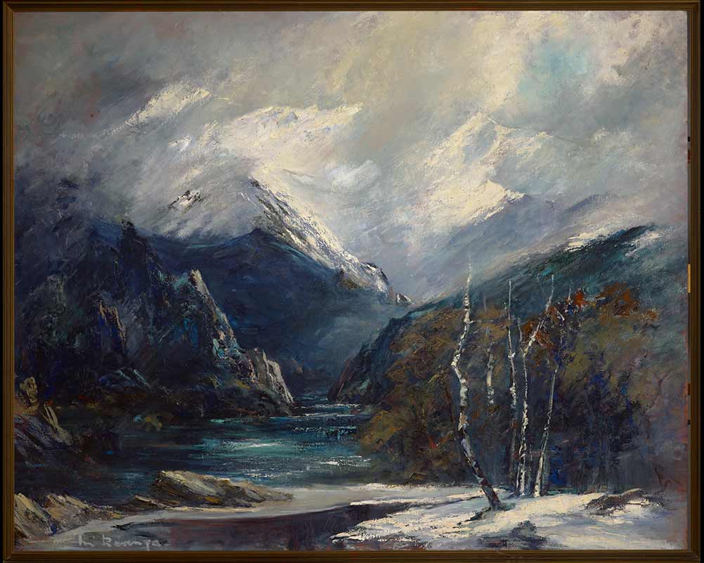 Esta obra titulada Paisaje Nevado perteneciente a Maria Revenga es una representación de un paisaje siguiendo la corriente del impresionismo. Esta pintado al Óleo sobre lienzo y tiene un tamaño sin marco de 128cm x 160cm. Ella es una paisajista nacida en Madrid, en diciembre de 1901, en el seno de una familia militar. Su infancia transcurrió en distintas provincias españolas debido a los diferentes destinos del cabeza de familia, en acuartelamientos nacionales, lo que le valió el alma viajera que siempre le acompañó. Estas impresiones acerca de los paisajes fueron los que forjaron su paleta y su trazo artístico que la distinguirían a lo largo de toda su vida. Pintó flores, montañas, bosques, paisajes con cascadas y frondas, el mar y tantos y tantos temas relacionados con la naturaleza, si bien su verdadera obsesión fueron los cielos plagados de nueves y las cumbres nevadas con grandes celajes nubosos. La artista llamó a sus paisajes “suspiros, porque son obras captadas en el momento y logro retenerlos”, de los accidentes y manchas de pintura involuntarios decía “¡no los borres! Son golpes de gracia”.
