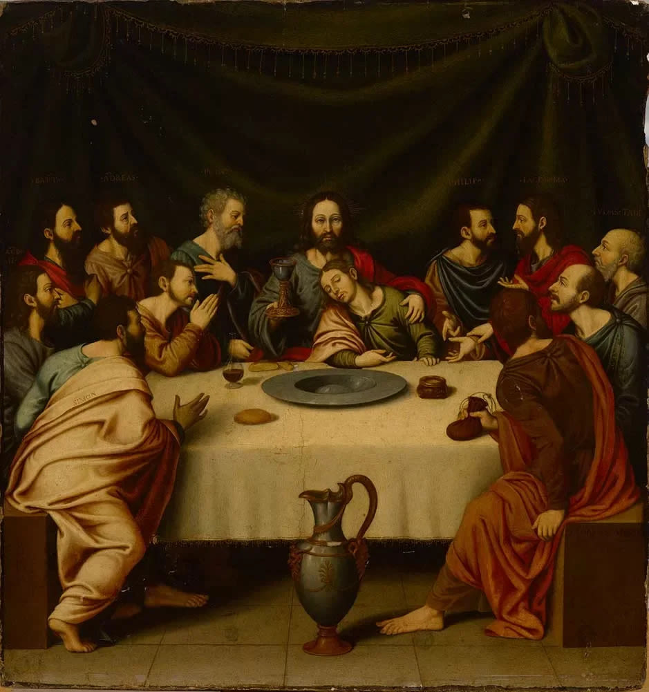 En este cuadro se representa La Última Cena . En un espacio con suelo embaldosado y una cortina negra, con cenefa decorativa en dorado a modo de escenario, centra la composición Cristo. En torno a él y a una gran mesa están los doce Apóstoles, algunos sentados, otros de pie. La mesa está cubierta por un mantel blanco y sobre ella hay varios elementos, destacando el pan y una jarra de vino. Cristo sujeta en su mano derecha una copa mientras que con la otra cubre el hombro de San Juan, que prácticamente está delante de él y con tono muy afligido. Casi todos los Apóstoles dirigen su vista a Cristo, excepto San Felipe y Judas: éste y Simón el otro Apostol del extremo contrario, están sentados y casi de espaldas al espectador. Cierra la composición en el suelo, en primer plano y en medio de los dos Apóstoles antes reseñados, una gran ánfora ricamente decorada. La Última Cena , es la última ocasión en que Cristo comió con los discípulos en Jerusalén antes de su detención, y en la cual anunció a los doce que uno de ellos le iba a traicionar. Obra pintada al Óleo.