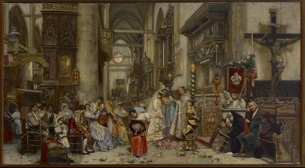 Escena que se desarrolla en el interior de una iglesia en la que se está celebrando una boda. En la parte central de la composición y en una de las naves laterales, pues por las dimensiones y el coro que se encuentra en la parte derecha y detrás del grupo de invitados es una catedral, se encuentran los contrayentes. El novio es un torero que luce sus galas de color azul turquesa, a su lado y recatada la joven novia. Ambos atentos a las indicaciones del sacerdote, respaldados por los padrinos, otra pareja que está pendiente del acto; el resto de personajes que conforman el cuadro, un grupo de una veintena de personas, incluido el monaguillo y la pareja de ancianos del primer plano a la derecha, ataviados con trajes de luces, mantillas y abanicos, están ajenos al enlace. El pintor utiliza una minuciosa pincelada, ya que predomina el dibujo en la composición. Utilizando una paleta rica en sepias con pequeños toques de color como el rojo, el turquesa y verdes, además del blanco.