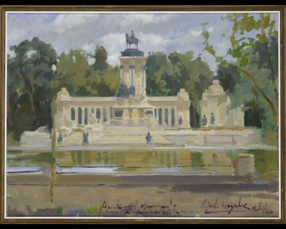 Imagen de un dia luminoso en un parque, concretamente en los jardines del Retiro de Madrid. Centra la composición en forma piramidal el imponente monumento erigido a Alfonso XII. En el primer plano se aprecia un espacio de tierra o paseo, a continuación el agua del estanque, delante de donde está asentado el monumento y tras éste hay una gran masa arbórea. Cierra la composición un pequeño espacio para el cielo azul salpicado de nubes blancas. El monumento creado a base de columnas fue encargado a partir de la iniciativa de la reina María Cristina, madre del rey: En 1902 se convocó un concurso nacional para construir ésta obra, eligiéndose al arquitecto José Graseus Riera, quien no la finaliza, e inaugurándose en 1922. En el basamento se encuentran tres esculturas alegóricas: La Paz, La Libertad y El Progreso. Desde el monumento central avanzan unas escalinatas, custodiadas por cuatro leones de piedra, que van a desembocar a las aguas. El conjunto escultórico está rematado en la parte superior con la escultura ecuestre en bronce de Alfonso XII, realizada por Mariano Benlliure en 1904, aunque cuenta con un número importante de otras esculturas, pues participaron en su creación un total de 20 escultores.