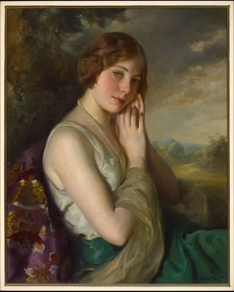 Retrato en medio cuerpo de una mujer joven: Está sentada y centra la composición. Aún estando de perfil, gira la cabeza hacia su derecha para mirar fijamente al frente. Viste una amplia falda color verde oscuro acompañada por una blusa blanca sin mangas y con amplio escote. Cubre parte de su espalda con un chal en tono dorado que se entrelaza en los brazos; éstos a su vez los tiene pegados al pecho, llevando las manos juntas hacia su mejilla izquierda y ladeando un poco la cara para posarla sobre ellas. Lleva un largo collar de perlas. Es pelirroja y tiene el pelo corto con la raya en medio. El semblante de su cara es dulce y sereno destacando los ojos azules, realzados por la luz que proviene del frente. El respaldo del sillón en el que está, lo cubre una especie de paño o manto morado bordado con detalles florales rojos y ocres. El fondo de la composición, aún estando tratado con color, luces y sombras y apreciándose en él una arboleda, no distrae la atención de la modelo. Victor Moya, como gran retratista, hace un exhaustivo estudio psicológico de la mujer. Aplica una pincelada muy fluida y pastosa, además de plasmar una gran riqueza cromática. Seguidor del estilo de Sorolla, tiene bien definida su línea de trabajo, dedicándose mayormente a realizar retratos de mujeres. Tiene un tamaño sin marco de 74cm x 59cm.